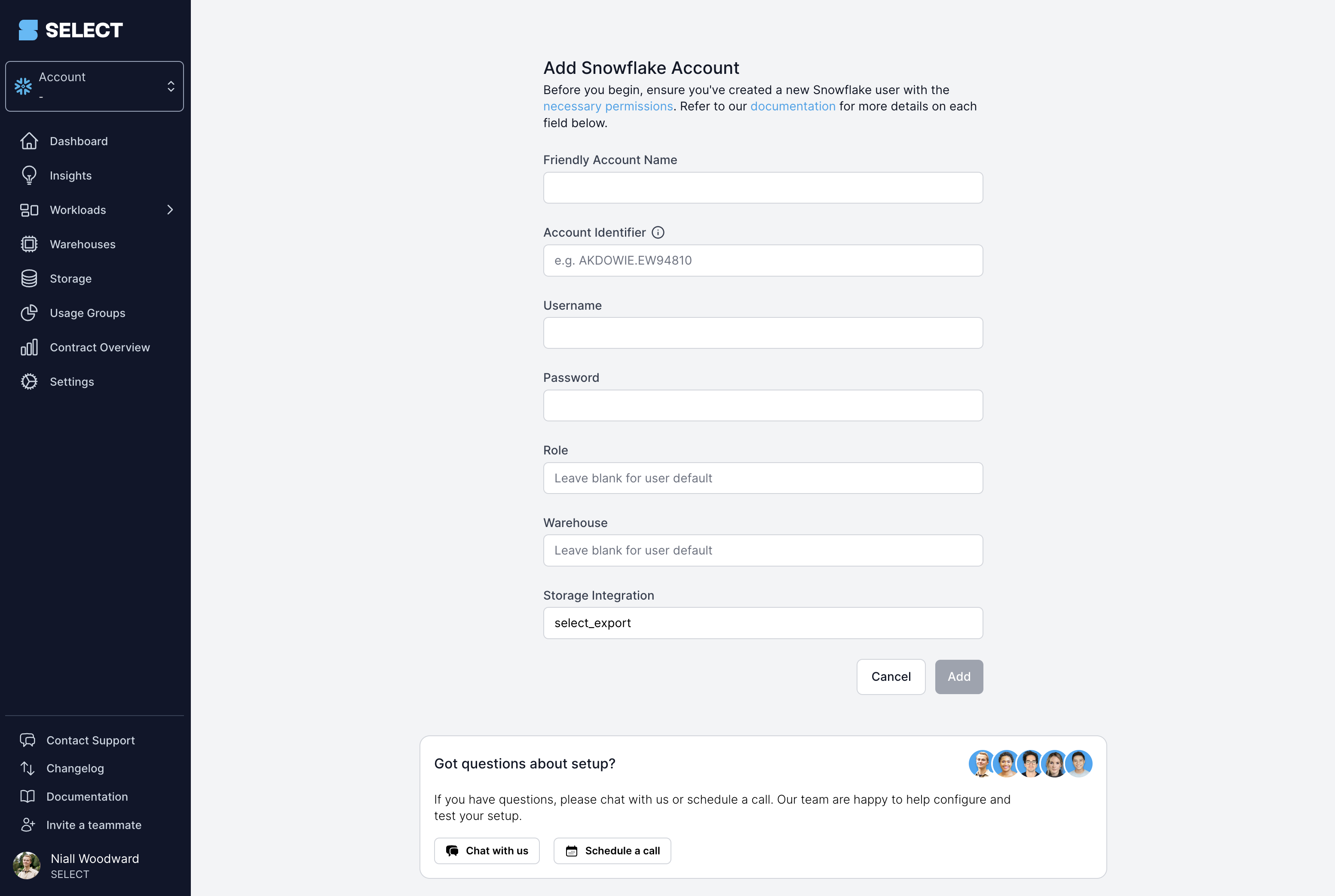 ホームページの「アカウントを追加」ボタンをクリックするか、設定 -> Snowflake -> 新規追加へと移動します。
